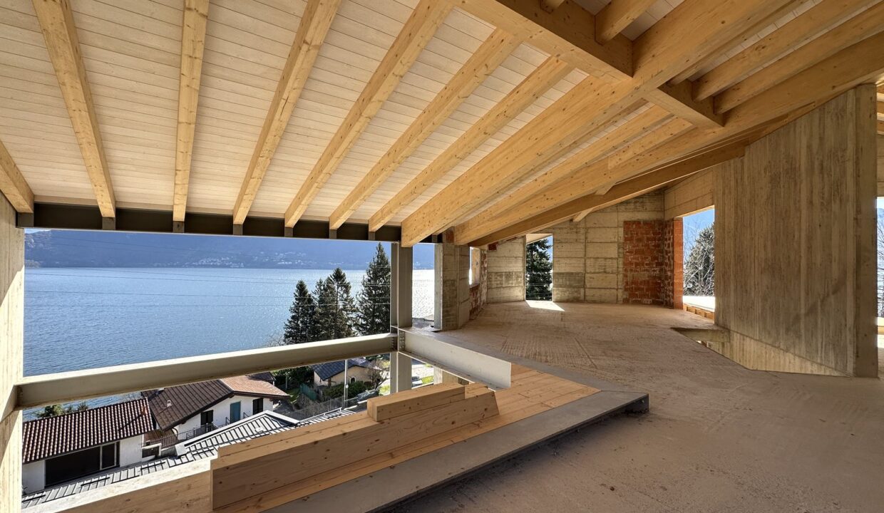 Il piano terra ospita una spaziosa zona giorno con cucina e pranzo, caratterizzata da grandi vetrate che offrono una vista panoramica sul lago. Vi sono anche uno studio/camera da letto e un bagno. L’ampio terrazzo esterno di 55 mq, di cui 25 coperti, è perfetto per pranzi e cene estive con vista sul lago. Nella zona soggiorno è presente un loft progettato per una vista sul tetto, dove potrebbe essere installato un elegante camino sospeso.