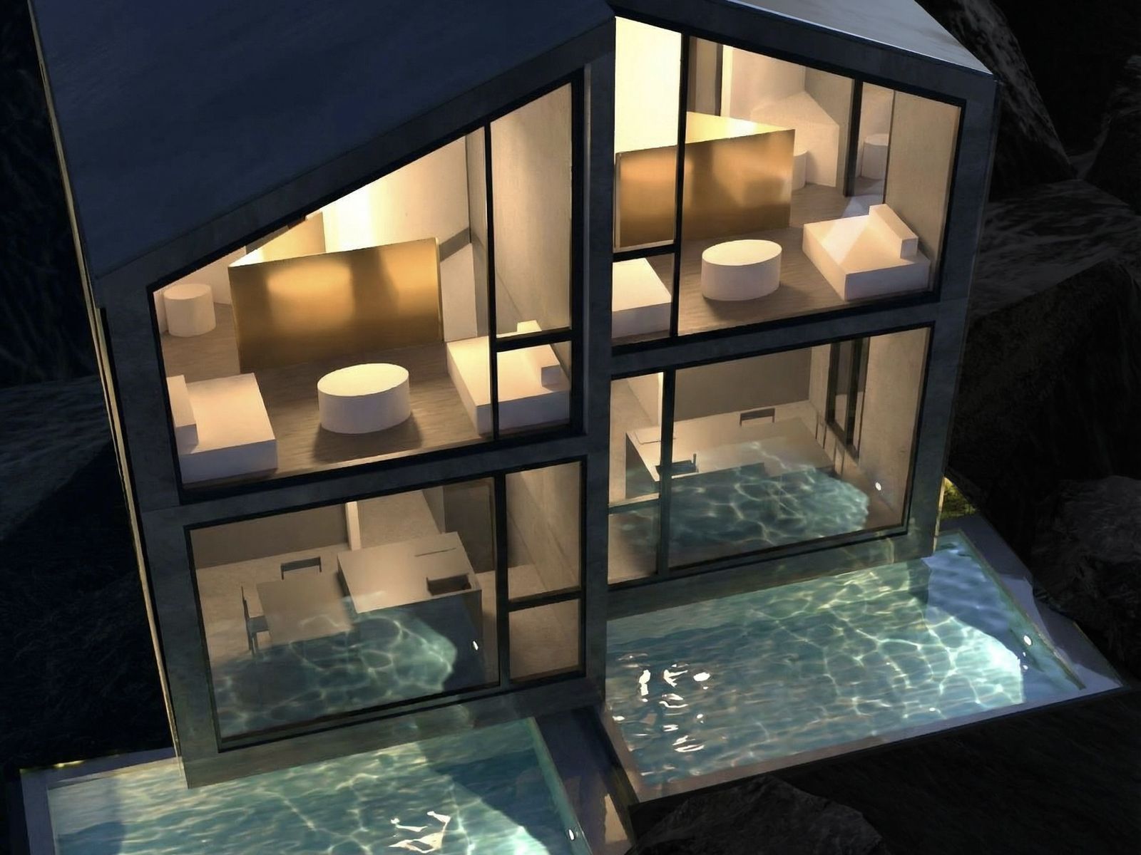 – Piano terra: Ampia zona giorno con grande vetrata panoramica e angolo cottura, camera matrimoniale, bagno finemente rifinito, accesso diretto al giardino e alla piscina